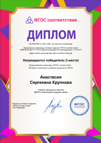 Диплом победителя Всероссийской олимпиады ФГОС соответствие". Итнернет- технологии в учебном процессе по ФГОС, 2021г.