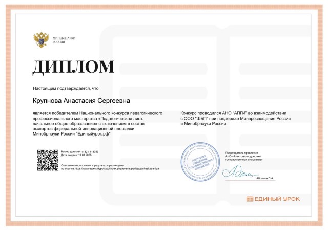 "Диплом победителя Национального конкурса педагогического профессионального мастерства «Педагогическая лига: начальное общее образование» инновационной площадки Минобрнауки России "Единыйурок.рф", 2025г.